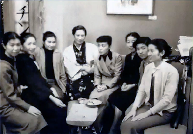 Iwami cited the influence of Onchi Kôshirô and Sekino Jun'ichirô, but, above all, Shinagawa Takumi (in particular, his collage work as well as his use of driftwood). Iwami was also a haiku poet who recognized a relationship between printmaking and poetry: "Haiku is a disciplined study. It forces one to eliminate what is not necessary, and that's why I use it as a spiritual exercise for my prints." [see Tolman ref.] She was a prolific artist who achieved recognition at the same level as her male colleagues. The novelist and collector James Michener (1907-1997) called her "the first woman in the history of Japanese prints ... to attain full stature." [see ref. below] First exhibiting in 1953 with the Japan Print Association (Nihon Hanga Kyôkai: 日本版画協会), Iwami then showed her prints from 1957 to 1964 at the Tokyo International Print Biennale, and, from 1957, every year at the print shows held by the College Women's Association of Japan in Tokyo. Her name and printmaking style became well known in the West after her inclusion in Michener's The Modern Japanese Print. An Appreciation (1962) with "Winter Composition No. 2" selected as one of the winning entries (see below). Iwami's abstractions based on water, sky, rock, and driftwood forms were readily appreciated by a wide global audience and she remains popular to this day. Iwami's best known prints make extensive use of embossing, driftwood patterns, mica, and applications of gold or silver leaf. She occasionally used collagraph, when, for example, she printed from fishing nets pasted on blocks. Her designs are confident and precise, her style refined and expressive. In the work shown above, Mizu no fu (Song of water, 水の譜) from 1978, several of her signature compositional elements are present. There are the prominent driftwood forms and the large circle, along with a gold-leaf wave pattern, granular textures, and an intense black background, all combining to enhance the impact of the design. As was one of the nine founding members of the Joryû Hanga Kyôkai (Women’s Print Association: 女流版画協会), also referred to as the Nihon Joryû Hanga Kyôkai (Japan Women’s Print Association: 日本女流版画協会), Iwami particpated in the group’s debut exhibition in October 1956 featuring their etchings, relief prints, and lithographs in a Tokyo gallery. For ten years, until its disbanding in 1965, the society continued to stage exhibitions, culminating in a show in New York City in 1965, before its members went on to pursue solo careers.