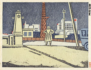 Maekawa also produced cityscapes and landscapes. Two early relatively examples are shown above. On the left is a view of the Fukugawa lumber yard, a site that dates back to the aftermath of the Edo-Meireki fire of 1657 when the shogunate authorized establishing lumber production on swamp-land east of the Sumida River, mainly in Fukagawa, where they also constructed a maze of canals, bridges, and landings. The area remained a lumberyard until the early 1970s, when it was relocated to Shin-kiba (New Lumberyard: 新木場). The old yard was then turned into Kiba Kôen (Kiba Park: 木場公園). The Fukugawa yard had a long history in woodblock prints. Utagawa Hiroshige (1797-1858), for example, designed a print for his Meisho Edo hyakkei (One hundred famous views of Edo: 名所江戸百景) in 1856. A number of sôsaku hanga artists portrayed these lumber yards as well, including Un'ichi Hiratsuka (1895-1997), Kishio Koizumi 1893-1945), and Masao Maeda (1904-1974). Maekawa's print was made in 1930 as part of the aforementioned collaborative series Shin Tokyo hyakkei. For a site that would often bristle with activity, the view is surprisingly serene. Immediately above right is a July 1931 print titled Shinijuku yakei (Night view at Shinjuku: 新宿夜景). This design was recut, renamed Shinjuku no yo (Shinjuku at night: 新宿の夜), and printed in December 1945 for the series Tokyo kaiko zue (Retrospective scenes of Tokyo: 東京回顧圖會), a portfolio of 15 prints created by nine artists who were all members of Nippon Hanga Kyôkai (Japan Print Association). The later set was published by Uemura Masurô (上村益郎) of Fugaku Shuppansha (富岳出版舎) and printed by the studio of Takamizawa Mokuhan Honsha Kôbô (高見澤木版本社工房). For the Shinjuku design, one notable change was the replacement of the dark blue sky with a perhaps intentionally bleaker very dark gray.