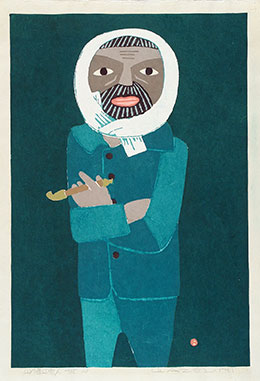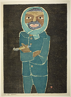After World War II, Azechi developed his distinctive style of using simplified forms and flat areas of color, usually portraying mountains and yama-otoko (mountain men: 山男), subjects for which he is best known. The examples shown immediately above for one of Azechi's yama-otoko designs illustrate two separate editions with very different results. Titled Yama goya no rôjin (Old man from the mountain hut: 山小屋の老人), it is a large print on paper measuring about 54 x 36 cm. The earliest (on the left), from 1953, is subdued in color and printed in a rough, expressive manner. The later edition (on the right) has a brighter palette and a more polished surface. Azechi, in some of his works starting from the mid- to late-1950s, began to experiment with this more "sophisticated" manner of printing in a heightened key. Perhaps he was distancing himself from the textured or emotive printing of his mentor Onchi Kôshirô.