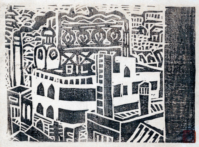 Fujimaki returned to his home in Tatebayashi in 1934, and by the following year he had completed an important painted handscroll titled "Picture scroll of the Sumida Riverbank" (Sumidagawa kishi emaki, 隅田川岸絵巻) consisting of four volumes, each around 14 to 16 meters long, now owned by the Tatebayashi City Daiichi Museum (館林市第一資料館). At this time Fujimaki was treated for tuberculosis and was also diagnosed with neurosis and depression aggravated by the stress of poverty and exhaustion from overwork. Even so, he continued to work, producing an essay in April of 1935 titled "Live in the times, transcend the times" (Shiryôkan jidai ni ikiyo, jidai o koe yo, 時代に生きよ、時代を超えよ). In June he was given a solo exhibition (rare at this time for young modern artists) at the Tokyodô Shoten Gallery in Kanda, Tokyo (Chiyoda Ward). Both Onchi Kôshirô and Maekawa Senpan praised the show [Ono, 1978, p. 270]. In September Fujimaki visited Ono Tadashige in Mukojima, Tokyo, presented him with a print, and then disappeared, saying he was going to visit his sister in Kojima-chô, Asakusa, Tokyo. He was never seen or heard from again. His mysterious and troubling disappearance is usually assumed to have been a suicide by drowning in the Sumidagawa, although a conspiracy theory or two have emerged linked with Ono Tadashige; however, these conjectures are beyond the scope of this brief article. Fujimaki's cityscapes are characterized by energetic block carving, some showing the influence of German Expressionism and certain monochromatic works by early Sôsaku Hanga artists, including Hiratsuka Unichi. The style is more like an endgrain engraving than a traditional Japanese woodcut, with areas gauged out, leaving behind the forms for inking (i.e., not carved on either side of lines in the ukiyo-e manner). He seemed fascinated by the modernizing of Tokyo, at this time barely a decade after the Great Kantô Earthquake had leveled the metropolis in 1923. Reconstruction brought about new iron bridges, office buildings, train stations, theaters, boulevards, and more.