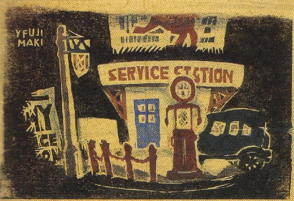 In 1933, Fujimaki's print Kyûyujo ("Gasoline filling station" 給油所) was accepted for exhibition by the Fourteenth Teiten (帝展), that is, the Teikoku Bijutsu Tenrankai (Imperial Art Academy Exhibition, 帝國美術展覧會). It seems a whimsical vision of a gas station, with the fuel pump rendered in an anthropomorphic manner, as well as the posts and chain, as if they were four people holding hands. The chromatic palette is unusual, too, in four colors, all textured.