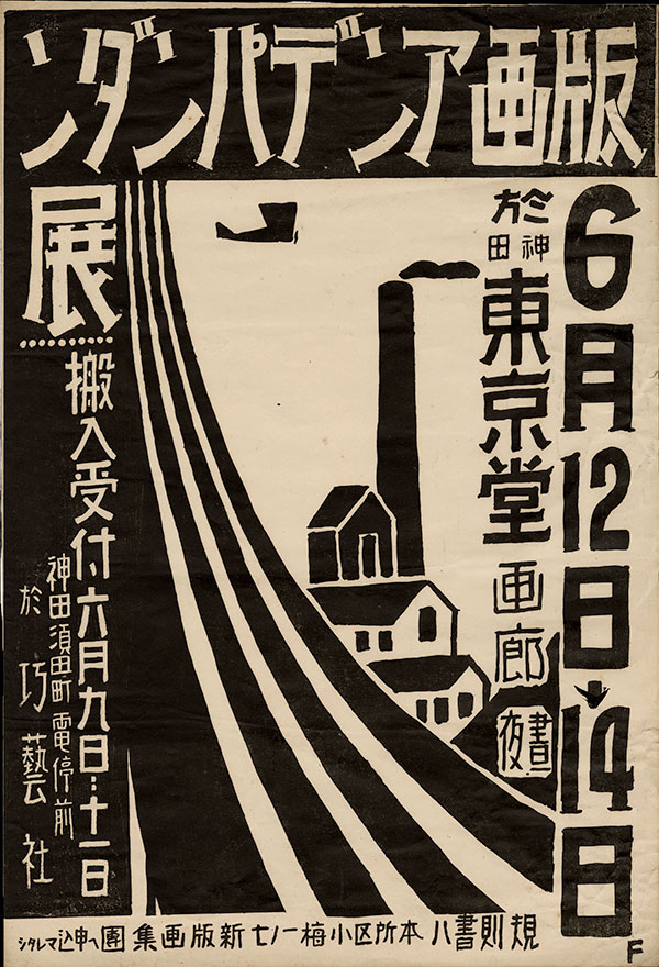 Fujimaki experimented with different approaches to printmaking. He used a triangular chisel to carve his blocks, and is credited with being among the first artists to use shina (科) plywood (Japanese basswood) instead of the traditional (ukiyo-e) cherrywood for keyblocks. He took up etching at the studio of the artist, businessman, art dealer, and magazine publisher (Etchingu, ‘Etching’) Nishida Takeo (西田武雄 1894–1961), a central figure whose patronage was critical to the young artists of the period. Very early in his career, the leading sôsaku hanga artist Sekino Jun'ichirô called Nishida’s etchings his "guiding lights." One of Fujimaki's most expressive and important (and largest) prints is the Red Sun (Sekiyô 赤陽) from 1934 (see image at the top of this page), said to depict a scene in Ueno Hirokoji, looking down toward Yushima from the Matsuzakaya Department Store. The experimental nature of his technique, more a gouging and scratching of the block than a traditional carving, is well represented here. The setting sun is hand painted, not printed, and the block was altered with impromptu compositional changes, including (so says the Museum of Modern Art, Tokyo website) "the lower part of a printed image cut out, slid upward and glued back on." An expressionistic work, the emotional charge is evident and potent. Late in his very brief career, Fujimaki designed a poster for an independent print exhibition at the Tokyodô Shoten Gallery (Tokyodô Shoten Garô, 東京堂書店画廊), Tokyo. The bold design depicts support cables on the Kiyosu Bridge (Kiyosu-bashi, 清洲橋), which spans the Sumida River in Tokyo, sweeping across the pictorial space from the top left to the lower right. A factory in the distance emits a cloud-like plume from its smokestack while a propeller plane is in flight. Using only black pigment, Fujimaki produced a clever combination of positive and negative text. The lively title at the top is a bit too large for the horizontal width of the sheet, so the character for "exhibition" (展) "falls" into the space near the top left, separated from additional smaller characters in the left border by a row of ten dots. There is a powerful graphic imagination at work here. Onchi Kôshirô described Fujimaki as "an important exemplar of Sôsaku Hanga for the sense of natural beauty of his designs. Among his works are some street scenes which convey a sad, poetic mood — apparently an aspect of his personality. He was in many ways a miraculous artist, both mysterious and wonderful."