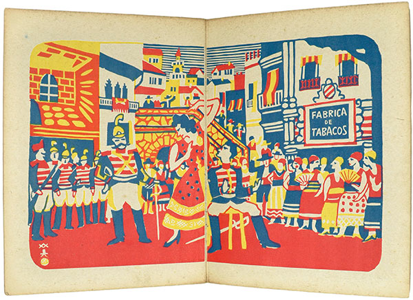 It is not clear exactly when Kawanishi might have heard Bizet's opera Carmen, but he was surely thrilled by it. He once recalled, "After Western circuses, Western Theater also frequently came to Kobe. This was an Italian opera troupe. You could see an authentic opera performance that changed every night. However, tickets were expensive and since I am quite poor, it was heart-breaking." Could Kawanishi have also seen the 1929 Japanese film titled Carmen directed by Takeuchi Shunichi? Regardless, in 1933, he designed a single-sheet ôban-size print for each of the four acts, plus an ôban sheet for the eight principal roles with English texts identifying the role names and vocal registers of the singers. Then, in late 1934, he designed different prints with the same scenes for each act, as well as another grouping of small figures in the eight roles. These images were published in Kawanishi's book Carmen (Karumeso: カルメソ). The book was published by Hirai Hiroshi of the firm Hanga Sô, Ginza from blocks carved and proofed in Kawanishi's atelier in Kobe. Shown below is the scene for Act I in which Carmen sings the provocative Habanera ("L'amour est un oiseau rebelle") outside a tobacco factory (the sign "Fabrica de Tabacos" is at the right in Kawanishi's print). While men plead with her to choose a lover, she throws a flower to the soldier Don José. Kawanishi was fascinated by foreign circuses, although not so with the traditional Japanese circus. As early as 1918, he visited a hippodrome virus and afterward made oil paintings of acrobats, horses, elephants, and other related subjects. He loved the gathering of so many foreign visitors and the strange animals. He first saw a lion at just such a circus, which he later referred to as the "Chiarini Circus," a term once used by the Japanese for any foreign circus, but taken from a much earlier circus run by Giuseppe Chiarini (1823-97), which toured Japan in 1886 and 1889. Kawanishi once said (see D'Orlando ref. below), "When you entered the tent, the smell of the animals, the smell of the circus, would merge into one. My heart captured everything moving before my eyes: the red robe of the animal trainer, with the golden decorations glittering in the light."