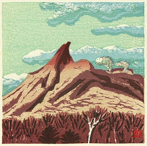 Maeda's final contribution to the Ichimokushû (First Thursday Collection: 一木集) was included in the last (1950) portfolio produced by the Ichimokukai (First Thursday Society: 一木会) led by Onchi Kôshirô. For this project, Maeda depicted the active Komagatake volcano in Hokkaidô (北海道). The small, square woodcut conveys the rugged mountain terrain at 1,131 meters (3,711 ft.), rendered with simple forms and shading, and extensive texture on the mountain and in the sky and clouds. The sharp diagonal peak of the mountain has a rather foreboding shape, as two plumes of water vapor, carbon dioxide, and sulfur gases (and ash) rise up from the middle right. The foreground in dark brown is punctuated by lively thick black strokes representing tree branches. The artist's Masa (政) seal is at the lower right.