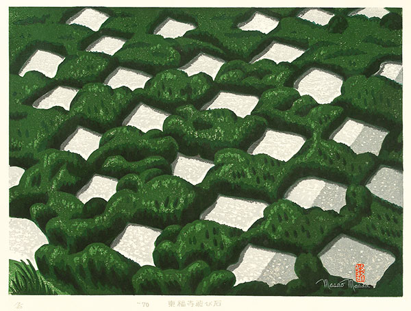 An example from late in Maeda's career is shown above — a view of stepping stones and thick green moss in a garden at the Tôfukuji (Tôfuku Temple: 東福寺) in Kyoto. Tôfukuji is a principal Zen temple in southeastern Kyoto. It was founded in 1236 by the imperial chancellor Kujô Michiie (1193-1252) at the request of the powerful Fujiwara clan. The temple was destroyed by fire but rebuilt according to original plans in the 15th century. Currently, the complex includes 24 sub-temples, although in the past the number has been as high as 53. The temple combines the names of two great temples in Nara that were also associated with the Fujiwara — the Todaiji and Kofukuji. The main gate has been designated a kokuhô (national treasure: 国宝) and, today, the site is particularly famous for its spectacular autumn colors, especially when seen from the Tsûten-kyō Bridge. There are a number of gardens in the various precincts of Tôfukuji. The moss garden is considered emblematic of the renewal of Japanese gardening principles in the 20th Century. Maeda's choice of viewpoint in his woodcut is surprising, as it leans toward abstraction, with pattern rather than mere representation as its focus. Public collections with works by Maeda Masao include the Art Institute of Chicago; British Museum, London; Carnegie Museum of Art, Pittsburgh; Chiba City Art Museum; Harvard Art Museum; Honolulu Museum of Art; Museum of Fine Art, Boston; Portland Art Museum; and Tokyo National Museum of Modern Art. BIBLIOGRAPHY