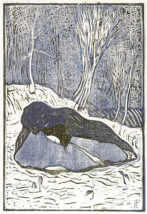 The first woodcut on this page, shown above, is perhaps Tanaka's most famous design. Dated to 1915, it was untitled, but today is known as "Melancholy" (image: 188 x 99 mm). Tanaka knew by this time that he was dying from tuberculosis, which must have had a bearing on what this image meant to him and probably reflected a deeply felt autobiographical significance. "Melancholy" could very well have been an expression of transcendence in the face of illness and death. Blue plumes envelope a fragile naked figure, poised on the tip of a small triangular form at the bottom edge of the picture frame. There is as well a form at the middle top within the blue plume that appears to be an eye. What this watchful element signifies is unclear, but it certainly contributes to an expressiveness that owes something to Western Symbolism, a late nineteenth-century art movement of French, Russian and Belgian origin, which Tanaka would have been familiar with, at least as reproduced in art and poetry periodicals. The magazine Shirakaba ("White Birch," 白樺 1910-1923), for example, had already published a woodcut by the Norwegian Edvard Munch (1863-1944) in its April 1912 issue. Moreover, for two weeks (March 14-28, 1914), there was a showing of German expressionist art (and Cubist and Fauve works as well) at the Hibiya Art Museum in Tokyo, a small private museum that primarily offered a platform for young artists. The exhibition included works by the Brücke artists Erich Heckel, Ernst Ludwig Kirchner, Max Pechstein and Karl Schmidt-Rottluff, plus artists such as Umberto Boccioni, Oskar Kokoschka, Wilhelm Morgner, Robert Storm-Petersen, Hanns Bolz, Arthur Segal and Fernand Leger. A photo survives from the exhibition, seen here above left. It is likely that Tanaka attended the show, although the displayed works might have done no more than confirm to him that other artists had already adopted expressionism as a mode of design. What can be read as the morbid romanticism of the three young friends who designed Tsukuhae was a central motif of the early twentieth-century zeitgeist, when many young Japanese intellectuals, artists, and writers saw themselves as bohemian and decadent.