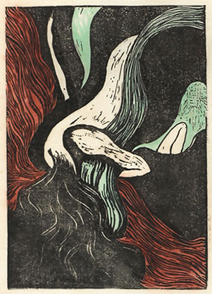 Another woodcut in the vein of Surrealist Expressionism is Tanaka's untitled and mysterious portrayal of two figures, one seemingly a dying woman draped in a blue garment or wrapping cloth, with only her head, skeletal left arm and right hand visible. Lying above or upon her is a figure shrouded in black with a blue mask-like face. One title suggested for this compelling and disturbing piece is Nama uru mono saru mono ("A person being born and dying": 生うるもの・去るもの). Another descriptive identification is Shi no shihai-sha no bishô (The smile of the ruler over death: 死の支配者の微笑). Regardless, what seems clear is that it likely expresses Tanaka's struggle with his illness and his angst over whether presaged his death (he had not yet been told that it was terminal).