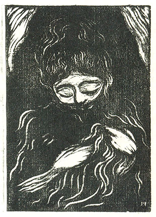 A design by Tanaka that appeared in Tsukuhae III is shown below. A woman holds what might be piece of clothing (although one could perhaps argue that it is the hair of another figure). Tanaka's familiar wave-lines are used to indicate that form, as well as the woman's shoulders and hair, and the flowing shapes in the top corners. Darkness envelopes the woman and her mouth is obscured as well. Large, heavily lidded eyes suggest sorrow. There is a kinship here between Tanaka's portrayal and several woodcuts depicting embracing or kissing couples by the Edvard Munch, although how far one could take the affinity is difficult to determine. Regardless, the expressive power of the two images shown below is undeniable and compares with the best of European Expressionist art during the 1910s.