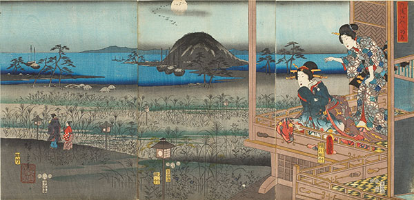 Gassaku were also popular in Edo. Among the most frequently encountered designs from that city were those shared by Utagawa Kunisada I and Utagawa Hiroshige I (and later, with Hiroshige II). Kunisada would draw the figures, such as actors or beautiful women, while Hiroshige I or II would provide the landscapes. The example shown below is a triptych titled Fûryû Genji — Akashi (Fashionable Genji — Akashi: 風流けんし明石 which could be written alternatively as 風流源氏明石), published in 4/1853 by Iseya Kanekichi (伊勢屋兼吉 whose seal reads "Kichi, Isekane": 吉 伊勢兼), with the blocks carved by Yokogawa Takejirō (横川彫竹). Two elegantly attired women on a balcony catch sight of Ashikaga Mitsuuji walking through the reeds at Akashi Bay. The story related to this scene was taken from an Edo-period reworking (and spoofing) of the original Genji monogatari (Tale of Genji: 源氏物語) by Murasaki Shikibu (11th century). Nise Murasaki Inaka Genji (A rustic Genji by a false Murasaki) was written by Ryūtei Tanehiko (柳亭種彦 1783–1842) with illustrations by Utagawa Kunisada, was published as popular, multi-volume illustrated novels called gôkan ("combined volumes": 合卷) by Senkakudô in 38 serial installments between 1829 and 1842. The story loosely mirrors Lady Murasaki's classic tale, but transposes the story into the floating world of Edo. The hero is no longer Genji, the imperial prince, but Mitsuuji, a popular playboy. Parallel to the original tale, the story follows the romantic exploits of Mitsuuji, but the correspondence to the original story varies widely. Resetting a classic tale within a modern context was a very popular literary and artistic genre during the Edo period called mitate (analog or comparison: 見立) that linked the contemporary with the historical, or the vulgar with the refined. Hiroshige later revised his landscape design for a triptych depicting Kanazawa Bay in Buyô Kanazawa hasshô yakei (Evening view of the eight famous sites at Kanazawa in Musashi province: 武陽金沢八勝夜景) from 1857; for another design from that series, see Hiroshige I. ©1999-2019 by John Fiorillo For more works by Yoshikuni, see Yoshikuni. For more works by Hiroshige, see Hiroshige I, Meiji Recuts, Mutamagawa, and Woodgrain. BIBLIOGRAPHY