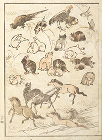 Included among the woodblock-printed books illustrated by Eisen is the three-volume ehon titled Keisai ukiyo gafu (Keisai's ketches of the floating world: 渓齋浮世画譜), as written on the title page (see image below left), although it is typically referred to as Ukiyo gafu. The set was published in Nagoya by Eirakuya Tôshirô (永楽屋東四郎 Tôhekidô, 東壁堂), who also issued Hokusai's famous Fugaku hyakkei (100 views of Fuji: 富嶽百景) in 1834-35 and the Hokusai manga (Sketches by Hokusai: 北齋漫画) from 1814 to 1878. The first two volumes of ukiyo gafu were drawn by Keisai Eisen Yoshinobu (渓齋英泉義信) and the third by Utagawa Hiroshige Ichiryûsai (歌川廣重一立齋). The long-term success of Hokusai's manga inspired Eirakuya to try his luck with publishing similar volumes by other artists. The Hokusai manner is clearly evident in Eisen's sketches (see below).