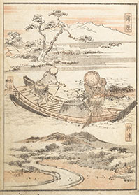 The best of Eisen's bijin ôkubi-e ("large head" pictures of beauties: 美人大首絵) are among his finest works. They express an awareness of the ethos of his time when realism, albeit stylized, came to define the typology of women seen in paintings and prints. Rather than continue with drawing the idealized, graceful creatures of the late eighteenth and early nineteenth centuries, Eisen (along with Utagawa Kunisada and Utagawa Kuniyoshi) turned toward a feminine iki (stylishness or spiritedness: 粋 or 粹) that was distinctly different from his predecessors' views of women. In Eisen's bijinga, there is greater angularity. The noses of his beauties are long and straight, and the faces overall are more rectangular. The double ôkubi-e shown above left is titled Yo o fukasahite asane no te (The habit of staying up late and sleeping in the morning: 夜をふかして朝寝の手) from a series published by Matsumura Tatsuemon titled Ukiyo shijû hatte (Forty-eight habits in the floating world: 浮世四十八手), circa 1821-22. The conceit of associating women with habits (good or bad) appeared in earlier ukiyo-e, for instance, Kitagawa Utamaro's series Nakute nana kuse (Seven habits to be without: なくて七癖), circa 1801, and Katsushika Hokusai's series titled Fûryû nakute nana kuse (Fashionable seven useless habits: 風流無くてななくせ) circa 1798. Other meanings of hatte (八手) in Eisen's series expand upon the idea, such as "method," "technique," or "trick." So it would seem that the two young women have not only slept in, but are preparing the meet the day with all the allure they might muster. An excellent single-figure ôkubi-e by Eisen is shown above right. It is titled Ki ga karusô (Cheerful-looking: 気がかるう) from the series Imayô bijin jûnikei (Twelve views of modern beauties: 今様美人拾二景). The courtesan is paired with an inset view of the Ryôgoku-bashi (Ryôgoku Bridge: 両國橋). The mitate here is a comparison between conventional scenic landscapes in and around Edo with a close-up view of a bijin. Here, she is tuning her shamisen (three-string musical instrument: 三味線), presumably while preparing to entertain a customer. Eisen produced some excellent surimono (privately issued prints: 摺物). In the image below left, signed "Keisai" (渓齋), he designed a surimono (217 x 180 mm) depicting a fuguruma (book-cart: 文車) and byôbu (folding screen: 屏風) decorated with a peacock and plum blossoms , c. late 1820s. The format is the standard shikishiban (nearly square poem card: 色紙判) used for countless surimono of the period. The extensively applied metallic pigment is a copper-rich brass used to emulate gold, intended here to invest the still life with an elegance and opulence associated with courtly life or, in the more pedestrian realm, wealthy merchant families. One poem, signed Jôyôsha Mitsusada, speaks of the increasing fragrance of scented plum throughout the night. The second poem, by Ryûôtei Edo no Hananari, describes the cherry blossoms of Edo bursting into bloom as if the flowers were loosely robed dancers in the golden glow of spring (the reference to gold partly alluding to the gold on the byôbu). In the surimono below right, from circa 1830, two young women are shown gathering haru no nanakusa (the seven herbs of spring: 春の七草). Since the Heian period (平安時代, 794-1185), the herbs were collected on the seventh day of January in the first lunar month as a talisman to ward off disease. The herbs were seri (Japanese parsley: 芹), nazuna (shepherd’s purse: 薺), gogyô (cutweed: 御形), hakobe(ra) (chickweed: 繁縷), hotokenoza (henbit: 仏の座), suzuna (turnip leaves: 菘), and suzushiro (garden radish leaves: 蘿蔔). Five poems are signed by each of the authors: Kakeitei Masuka, Sessôan Matsukado, Shinettei Ikura, Yukinoya Morikage, and Shinratei Manzô (森羅亭萬象 1763-1831, leader of the group). The poetry club Manji-ren (卍連 a subgroup of the Yomo-gawa, the "All directions club," 四方側) is identified by its crest, which appears on the kimono of the kneeling woman and the obi of the standing beauty. The leader of the Yomo-gawa was the eminent poet Yomo Utagaki Magao (四方歌垣真顔 1753-1829).