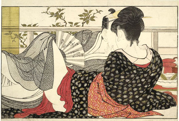 The depiction of lovers involved in domestic tragedies was one of the principal themes of romantic passion in Japanese printmaking (much more so in Edo than in Osaka). These tales typically involved conflicts between social obligations (giri, 義理) and personal emotions or "human feelings" (ninjô, 人情), and at their most extreme, shinjû ("inside the heart," but signifying "double suicide": 心中). Utamaro's innovative compositions emphasized the emotional and psychological aspects of these characters. For more on this topic, see Utamaro's Tragic Lovers. Also see the portrayal of Ohan and Choemon below. Expression, gesture, and placement serve as principal components of Utamaro's graphic language. A particular design element that plays an important role in his double portraits is the intimate gesture. Utamaro accomplishes this with imaginative arrangements and attention to detail, as with the placement of the woman's hand in the "Utamakura" erotic design shown above, or the young boy's fingers in the 1803 mother-and-son print just discussed. In his middle and late periods Utamaro explored the possibilities of depicting states of mind, down to specific emotions, as well as personality types, through the drawing of the face as well as with what we today would call "body language." This is seen, for example, in a design from the series Fûryû goyô no matsu (Elegant pines of five-fold needles: 風流五葉の松), in which a young maid secretly passes a letter to her mistress, possibly a geisha. The maid whispers something into her mistress's ear, likely a communication of love from a suitor. It is all endearingly captured — the maid lifting her head and stretching her neck, the geisha leaning forward, her expression one of focused attention as she reaches for the letter. This is quintessential Utamaro. The example below right portrays the tragic lovers Ohan and Chôemon from the series Ryûkô moyô Utamaro gata (Fashionable patterns in the Utamaro style: 流行模様歌麿形). In real life, the young Shinanoya Ohan and the middle-aged Obiya Chôemon were the murder victims of a robber; however, popular imagination soon turned the incident into a story of ill-fated lovers. In various popular tales and theatrical adaptations, Obiya Chôemon, a married, forty-year-old obi merchant in Kyoto, falls in love with Ohan, his next-door neighbor's fourteen-year-old daughter, and their affair results in her pregnancy. Scandalized, Ohan decides to kill herself, and Chôemon vows to join her in death. Soon afterwards, the lovers drown themselves in the Katsura River. Nevertheless, Utamaro has chosen to portray the lovers at a more playful moment, as Ohan drapes herself over Chôemon in a gesture of coquettish intimacy. It is a startlingly original composition for a single-sheet print of this period.