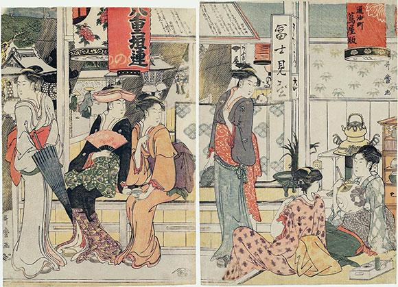 Above all, Utamaro was the premiere designer of bijinga (pictures of beautiful women: 美人画) during the 1790s and early 1800s. Among the glories of his oeuvre are many ôkubi-e ("large head pictures" or bust portraits: 大首絵) such as the masterpiece on the right, circa 1793-94, titled momo-omou koi (Contemplative love: 物思恋) from the series of five known designs titled Kasen koi no bu (Anthology of poems: the love section: 歌撰恋之部). None of the women are courtesans or connected with the Yoshiwara pleasure quarter in Edo, as was often the case with bijinga. The drawing style is refined and the close-ups expressive, with hints of individuation among the women in their facial characteristics, a trait not usually found in bijinga. In this instance, the beauty is possibly middle-aged and married, and some say reflecting on a past love or present lover. Utamaro studied with the Kanô-trained Toriyama Sekien (鳥山石燕), 1712-1788), a pen-name of Sano Toyofusa (佐野豊房), an 18th-century scholar, kyôka poet, and ukiyo-e artist of Japanese folklore. Utamaro's earliest known work is a small image in the haiku anthology Chiyo no haru (Eternal spring: 千代春 or simply ちよのはる) published in 1770, with 48 illustrations mostly by Toriyama Sekien and his pupils. Utamaro's contribution was a picture of three eggplants signed Shônen Sekiyô ga (painted by the youth Sekiyô: 少年石要画). His second art name was Kitagawa Toyoaki (北川豊章), which he used at least as early as 1775 with a cover illustration on a libretto for the Tomimoto (富本) school of chanting and the kabuki play Shikû-hatte koi no showake (Forty-eight famous love scenes: 四十八手恋所訳) at the Nakamura-za, Edo. The first use of the Utamaro name appears to be for a kibyôshi titled Minari daitsûjin ryaku-engi ("Short history of the grand connoisseurs": 身貌大通神略縁起) in 1781. ![]() Around 1782, Utamaro began producing print designs for the publisher Tsutaya Jûzaburô (蔦屋重三郎), and by the late 1780s he was providing illustrations for some of the best kyôkabon (books of playful verses: 狂歌本) ever published, such as the two-volume Ehon mushi erabi (Picture book of selected insects: 画本虫撰) in 1788 and the two-volume Momo chidori kyôka awase (Myriad birds, comparisons in playful verses: 百千鳥狂歌合) from 1791. An example from Ehon mushi erabi is shown above, a two-page spread depicting a tonbô (dragonfly: 蜻蛉) and chô (butterflies: 蝶). As with all the images in this compendium, one notices some influence of Chinese Ming publications, including the painting manual Jieziyuan Huazhuan (Mustard Seed Garden: 芥子園畫傳) of 1679, whose contents were first published in Japan as Kaishien gaden in 1748, or Japanese manuals derived from Chinese sources such as Minchô seidô gaen (The living garden of Ming painting: 明朝生動画園) of 1746 by Ôoka Shunboku (大岡春卜 1680–1763). One of Utamaro's crowning achievements in book form was his Utamakura (Poem of the pillow: 歌まくら or 歌枕) from 1788, one of the finest erotic works ever produced in any culture. In a style both delicate and forthrightly expressive, it offers diverse subjects ranging from young romantic love to shocking sexual violence. Among the images is the famous intimate view of lovers in a private second-floor room of a teahouse (see below), much reproduced in reference books on ukiyo-e and erotica. The tender gesture of the woman's had placed upon her partner's face as well as his fingers gripping her shoulder are most unusual gestures for ukiyo-e, even in shunga. The transparency of the man's robe reveals more of the woman's leg and enhances the erotic mood. Inscribed on the fan is a suggestive poem written by Yadoya no Meshimori (宿屋飯盛 1754–1830) that reads Hamaguri ni / hashi o shikka to / hasamarete / shigi tachikanuru / aki no yûgure (Its beak caught firmly / in the clam shell / the snipe cannot / fly away / of an autumn evening: 蛤に はしをしっかと はさまれて 鴫立ちかぬる 秋の夕ぐれ). ![]() The influence of Torii Kiyonaga was evident in Utamaro's oeuvre in the early 1780s, and while it lingered into the late years of that decade, by that time Utamaro had begun to realize a more individualized manner of drawing the idealized faces of bijin. The following diptych in aiban-format, Fujimi Chaya no misesaki (Storefront of the Fujimiya Teahouse: 冨士見茶屋の店先), was published by Tsutaya Jûzaburô circa 1789-90. The women indeed appear to possess an updated Kiyonaga appearance and demeanor, not yet attaining the distinctive visions that will epitomize the stylistic authority of Utamaro's bijin designs during the 1790s. ![]() After around 1792 Utamaro set about designing many of the bijinga masterpieces long recognized as icons of ukiyo-e. In a pair of three-quarter-length portraits, Utamaro portrayed two of the great beauties of the day, each set against a white mica background and alongside kyôka poems. One celebrity was Ohisa, the daughter of Takashima Chôhei, the proprietor of a rice-cake shop in Yagenbori, Ryôgoku in Edo (see below on left). Ohisa apparently served at a teahouse that was part of the business. In 1793 she would have been sixteen years old. The poem in the cartouche reads Akiyô mo / cha mo koboretsutsu / samenu nari / yoi hatsuyume no / Takahshimaya tote (Charms and tea are brimming over / and neither gets cold / let me not wake / from this lucky dream of the New Year / at Takashimaya); signed by Karabana no Tadaaya. * Equally alluring was Okita of the Naniwaya, located near the Zuijin Gate of the Asukasa Temple in Edo (see below on right). She would have been only fifteen years old in 1793. The headnote reads Naniwa-chô chaya ni yasuraide and the poem Naniwazu no / na ni ou mono wa / yuki kai ni / ashi no tomaranu / hito mo araji na (Resting at a teahouse in Naniwaya-chô: Myriad as the re